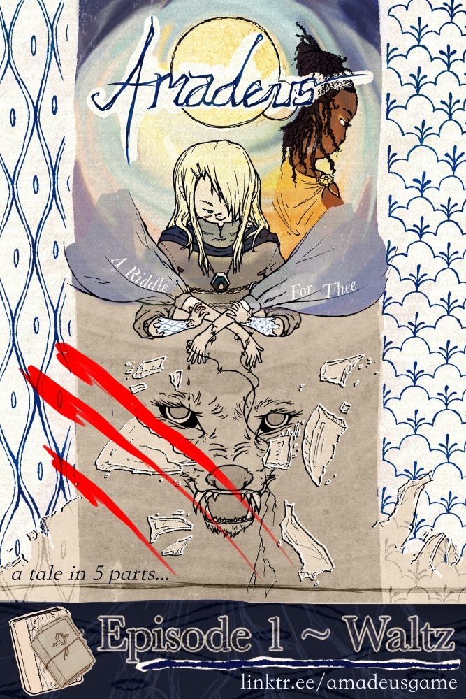My biggest project is Amadeus: A Riddle for Thee, a VN/Point-and-Click hybrid about a 16-year-old werewolf who sells his memories to a Witch. Episode 1 of 5 out now!